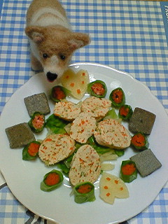 真ん中のは、ささ身を細かく切って、おからの粉末と人参とキャベツのみじん切りを混ぜてレンジでチン。