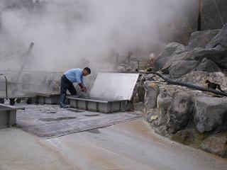 右の写真のように、おじさんが、専用のかごに入れて、源泉で茹でて!?ます。