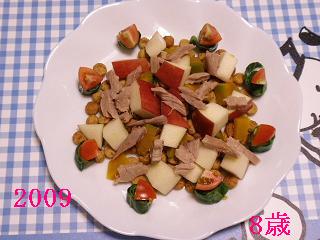 8歳の今年は、周りの、キャベツを巻いて輪切りにして、プチトマト乗せたのを、8個並べてます。